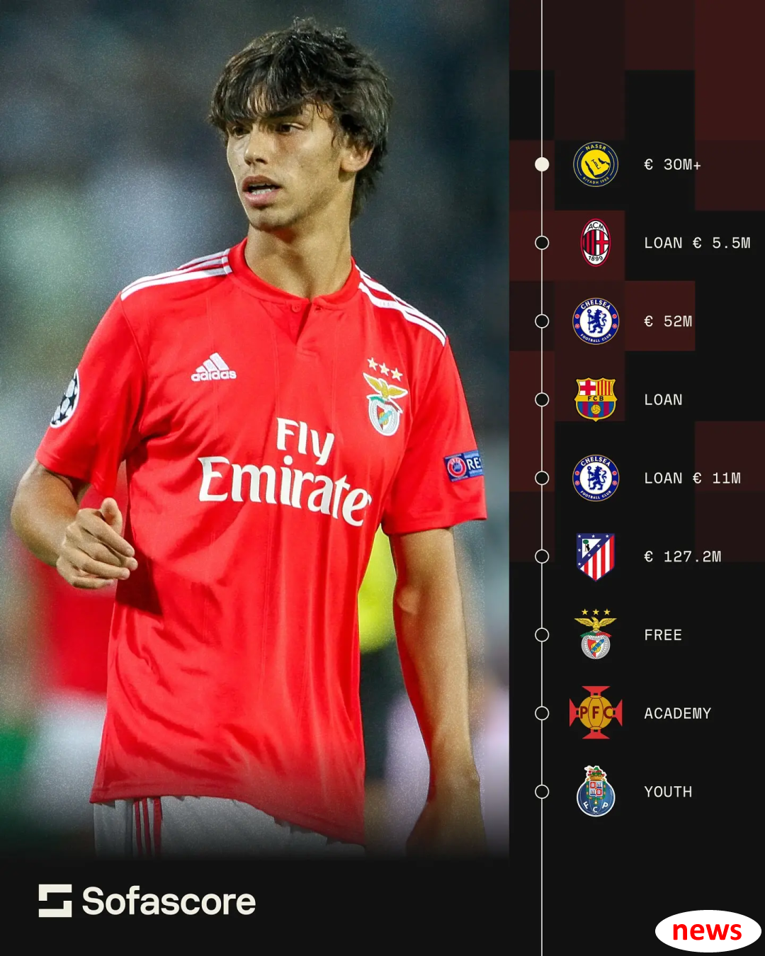 Tiền đạo người Bồ Đào Nha 25 tuổi, Felix đã ra mắt tại Benfica Thanh niên Huấn luyện. Trong cửa sổ mùa hè năm 2019, Felix 19 tuổi đã tham gia Atletico Madrid với mức phí chuyển nhượng 127 triệu euro và giành giải Golden Boy vào tháng 11 cùng năm, nhưng kể từ đó, màn trình diễn của Felix chưa bao giờ đáp ứng mong đợi của mọi người.