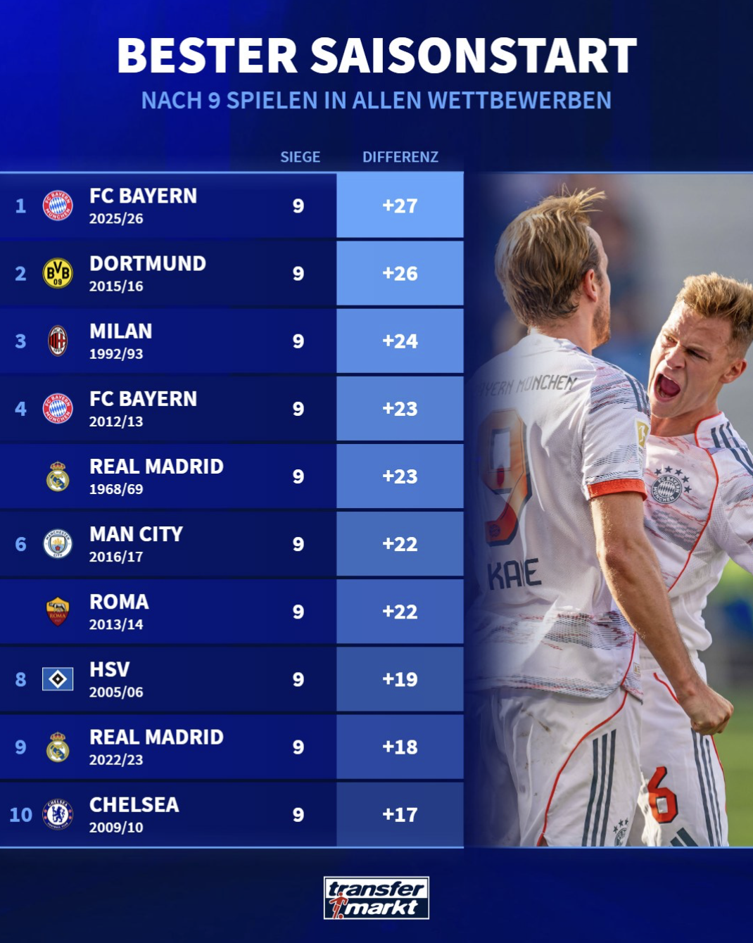 Xếp hạng kết quả tốt nhất sau 9 trận trong tất cả các cuộc thi trong lịch sử: Bayern đã giành được mục tiêu 27 bàn thắng mùa này
